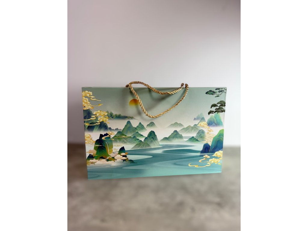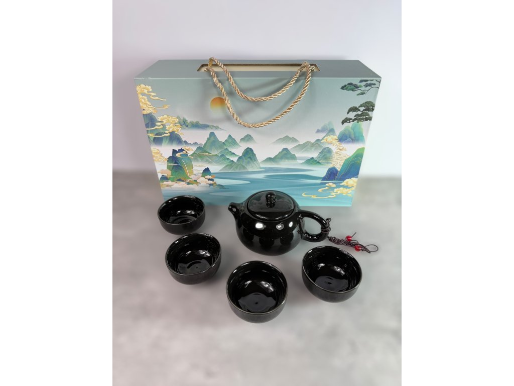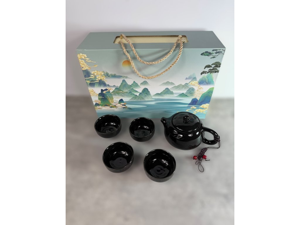 Krásná čajová sada inspirovaná tradiční čínskou estetikou, uložená v pevné dárkové krabici s nádherným motivem horské krajiny.