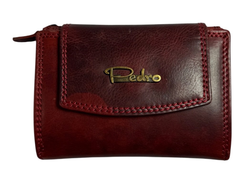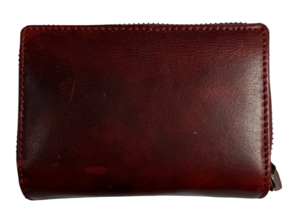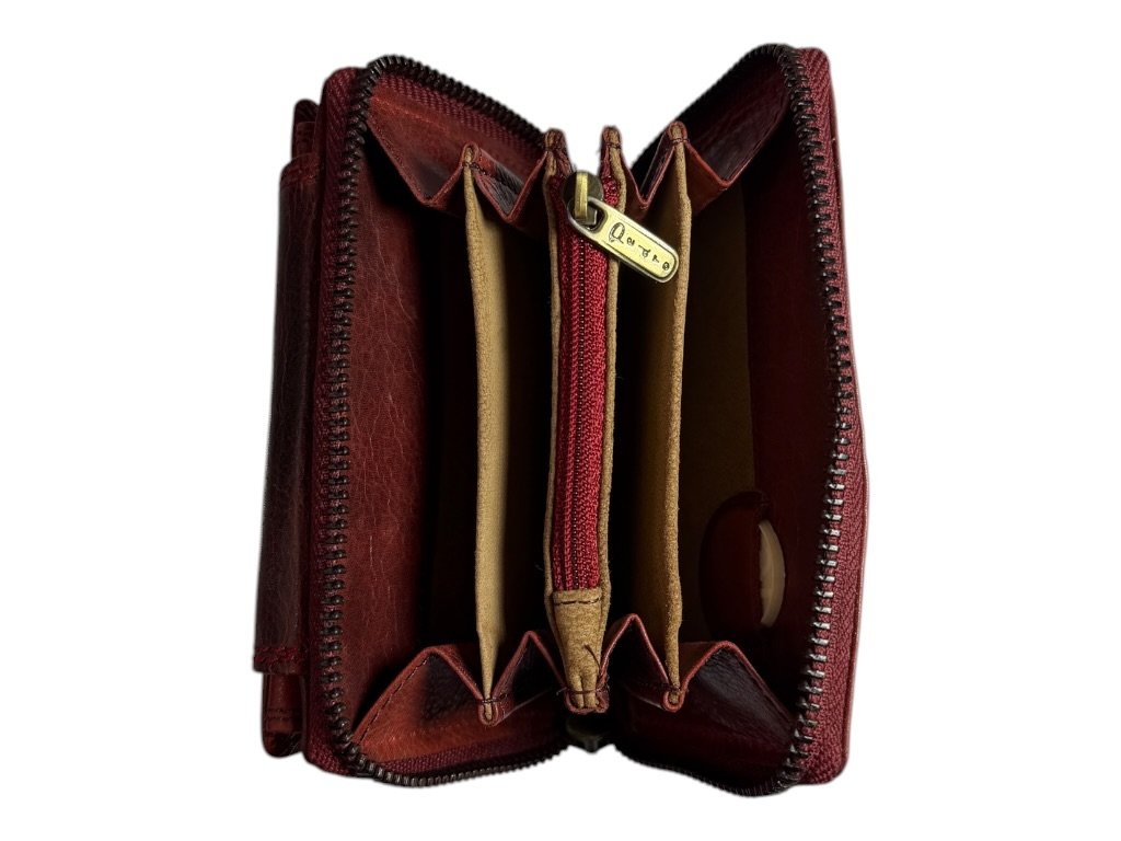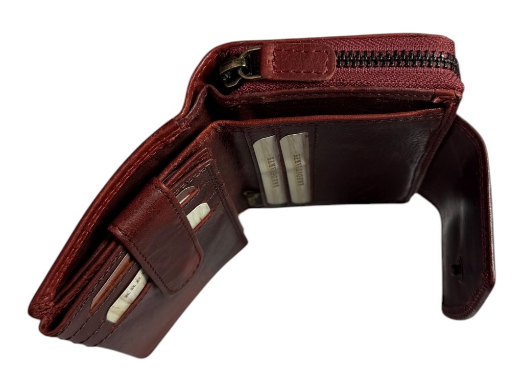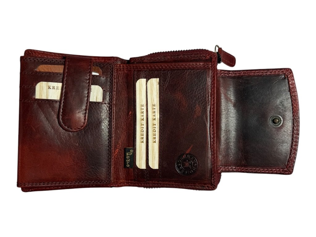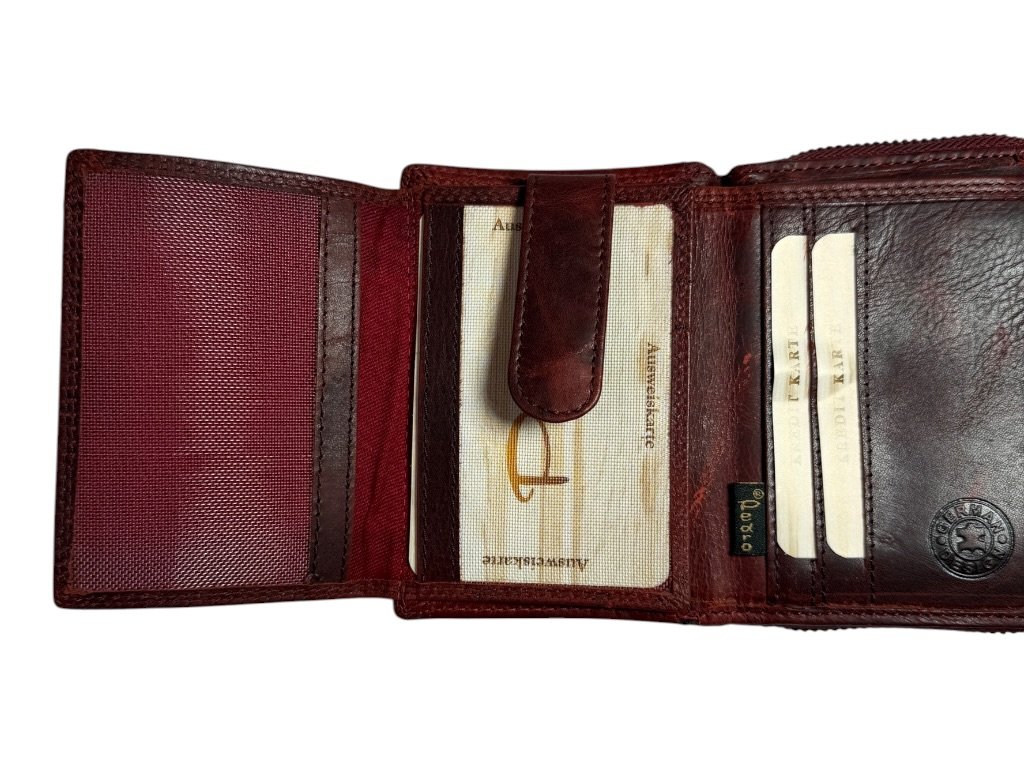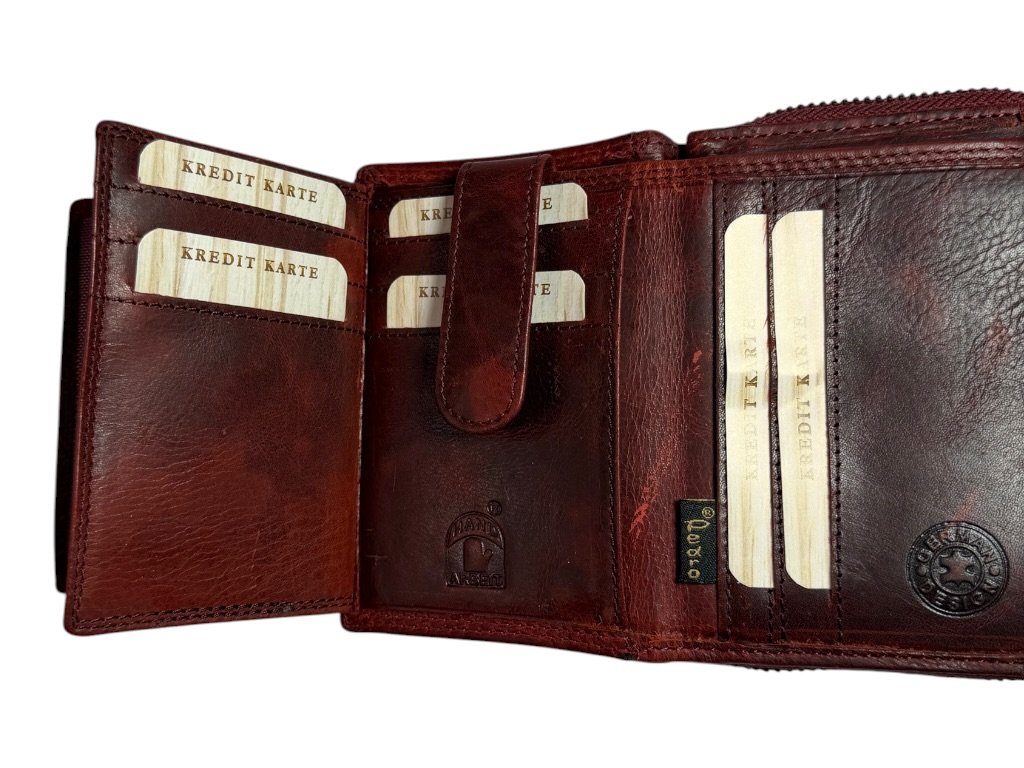 Stylová peněženka z pravé kůže v tmavě červeném provedení, která kombinuje klasický vzhled s vysokou praktičností.