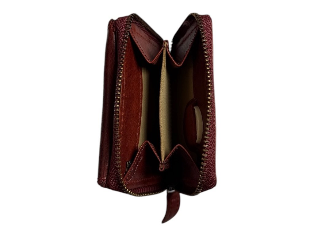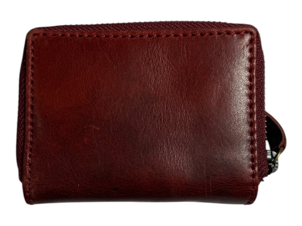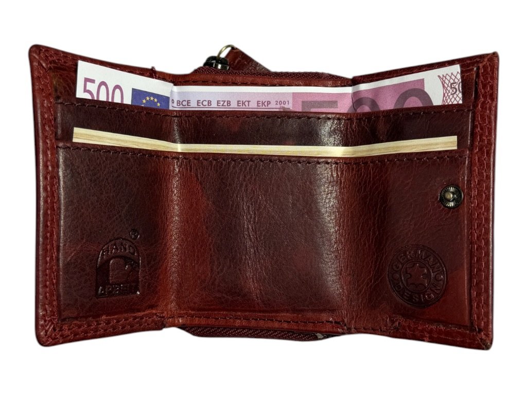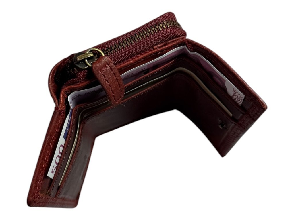 Malá kožená peněženka v elegantním červeném provedení s kapsou na mince na zip a přihrádkami na bankovky. Kompaktní a ideální do každé kapsy.