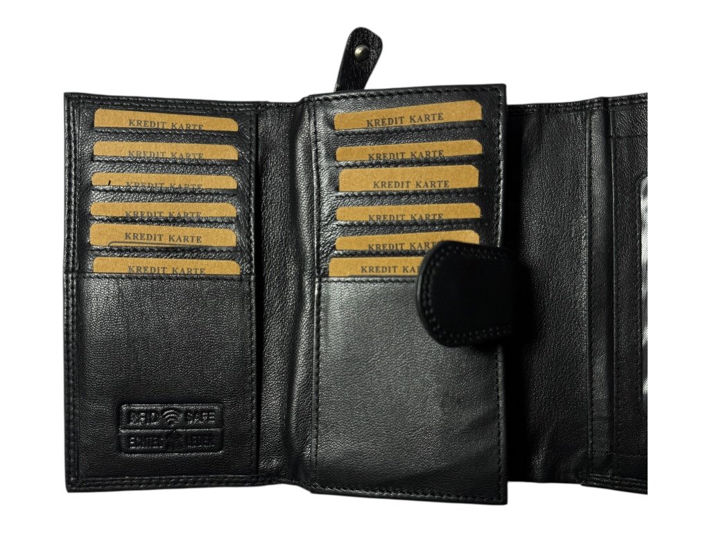 Peněženka má bezpečné dvojité zapínání na cvoček a obsahuje RFID ochranu, která chrání vaše platební karty před neoprávněným skenováním.