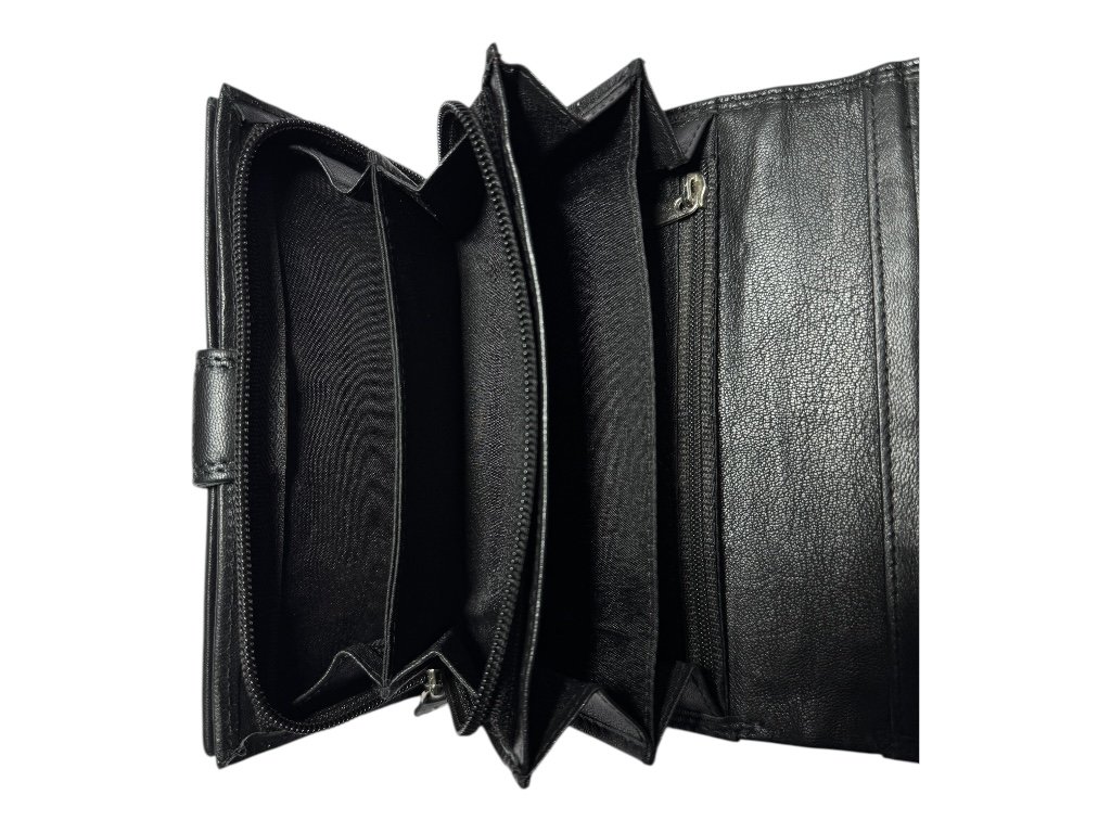 Vnitřní prostor je rozdělen přehledně – 16 přihrádek na karty, 2 prostorné kapsy na bankovky, malá kapsa na zip a velká zipová část se dvěma přihrádkami na drobné či účtenky.