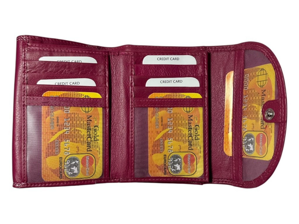 Uvnitř najdete 12 přihrádek na karty, 1 skrytá přihrádka na suchý zip, 2 prostorné přihrádky na bankovky, 2 extra přihrádky pro účtenky nebo vizitky a malou kapsu na zip pro drobné mince.