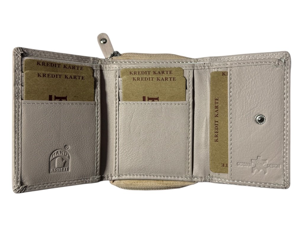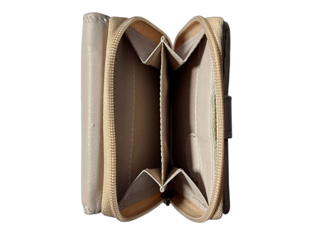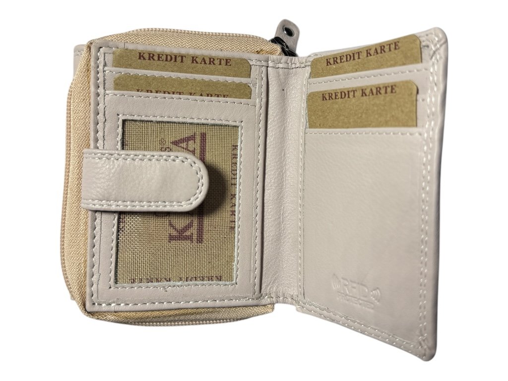 Navzdory menším rozměrům nabídne překvapivě prostorné vnitřní uspořádání – 17 přihrádek na karty, 1 přihrádku na bankovky a velkou kapsu na zip se dvěma oddíly, kam snadno uložíte mince nebo drobnosti.