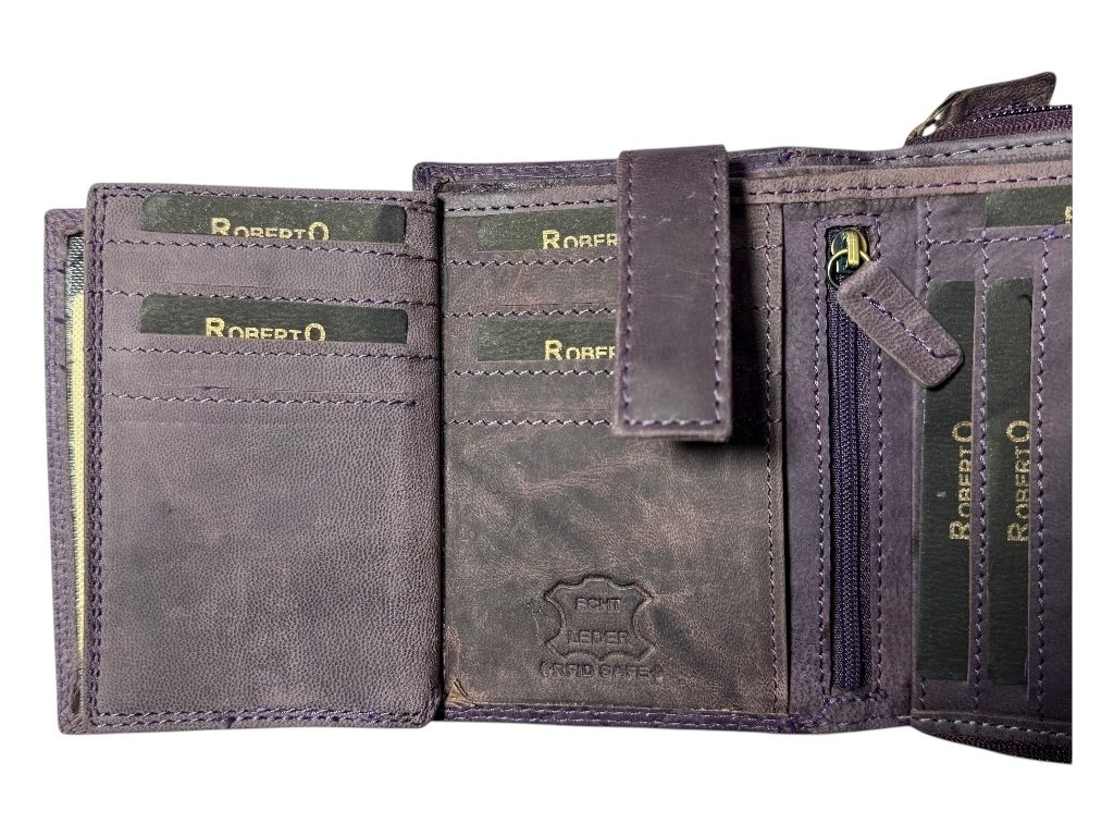 Uvnitř najdete 19 přihrádek na karty, 2 přihrádky na bankovky, 1 menší kapsu na zip a velkou kapsu se dvěma oddíly + další malou kapsou na zip.