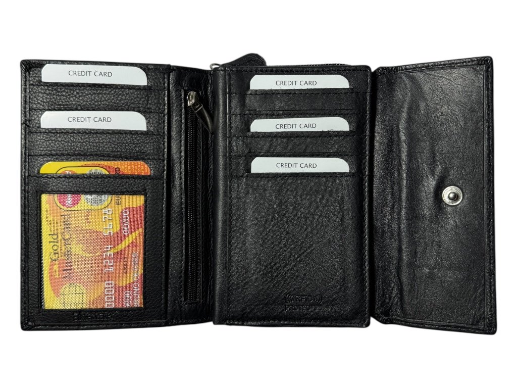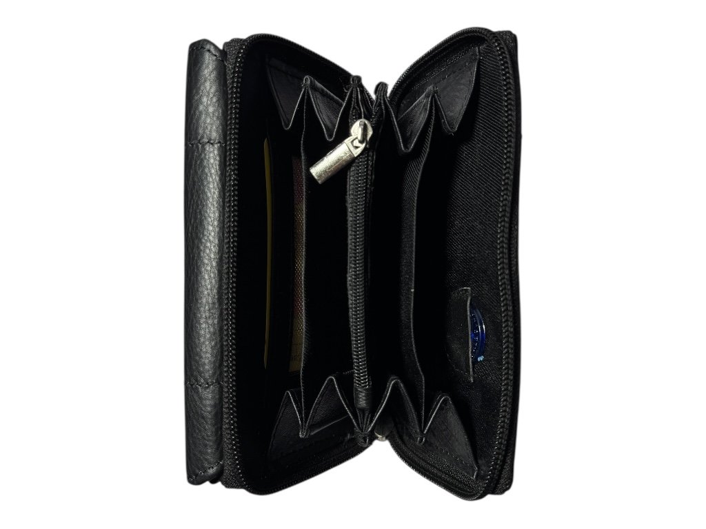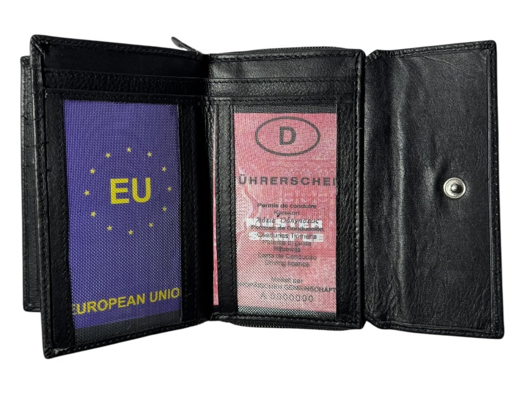 Uvnitř najdeš dvě samostatné přihrádky na bankovky a jednu menší kapsu na zip pro drobnosti. Velkou předností je prostorná zipová sekce, která se otevírá široce a pohodlně. V ní jsou 4 oddělené přihrádky, takže mince, bankovky nebo účtenky můžeš třídit podle potřeby. Součástí je také malá vnitřní zipová kapsa, kam bezpečně uložíš drobné mince nebo jiné cennosti.