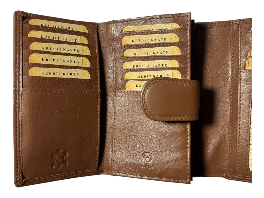Uvnitř najdete 22 přihrádek na karty, 1 oddíl na bankovky, 2 prostorné volné přihrádky a velkou kapsu na zip se dvěma oddíly, která je ideální na mince.