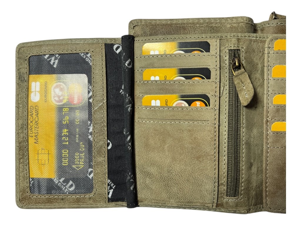 Peněženka nabízí mimořádně prostorné uspořádání – 34 přihrádek na karty, 2 oddíly na bankovky, 1 menší kapsu na zip a velkou kapsu se čtyřmi přihrádkami, kam pohodlně uložíte mince, účtenky i drobnosti. Přehledné členění a zapínání na patent zajišťuje bezpečné a pohodlné používání.
