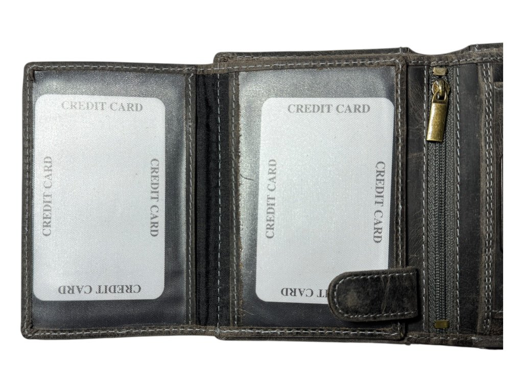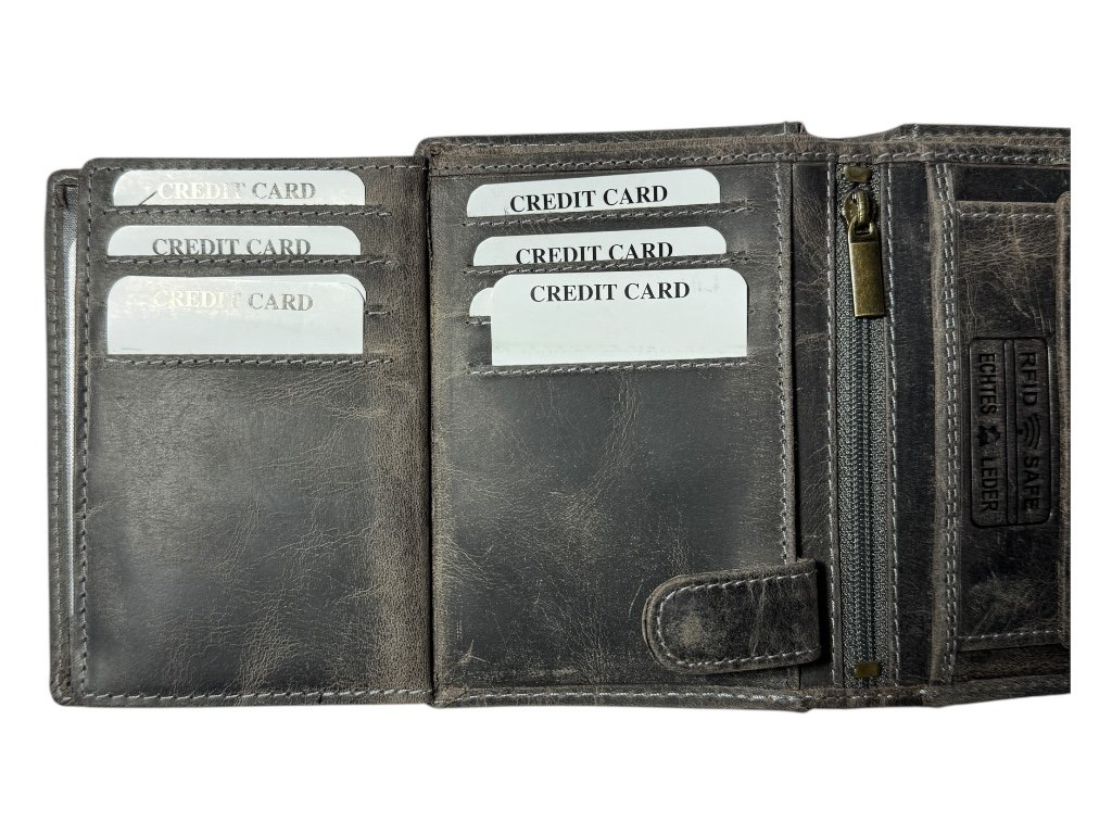 Uvnitř najdete 15 přihrádek na karty, 2 přihrádky na bankovky, malou kapsu na zip a kapsu na mince uzavíratelnou na cvoček.