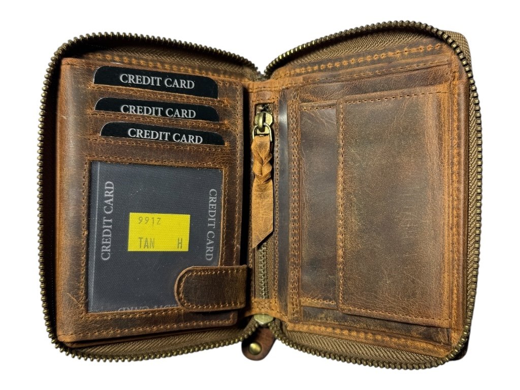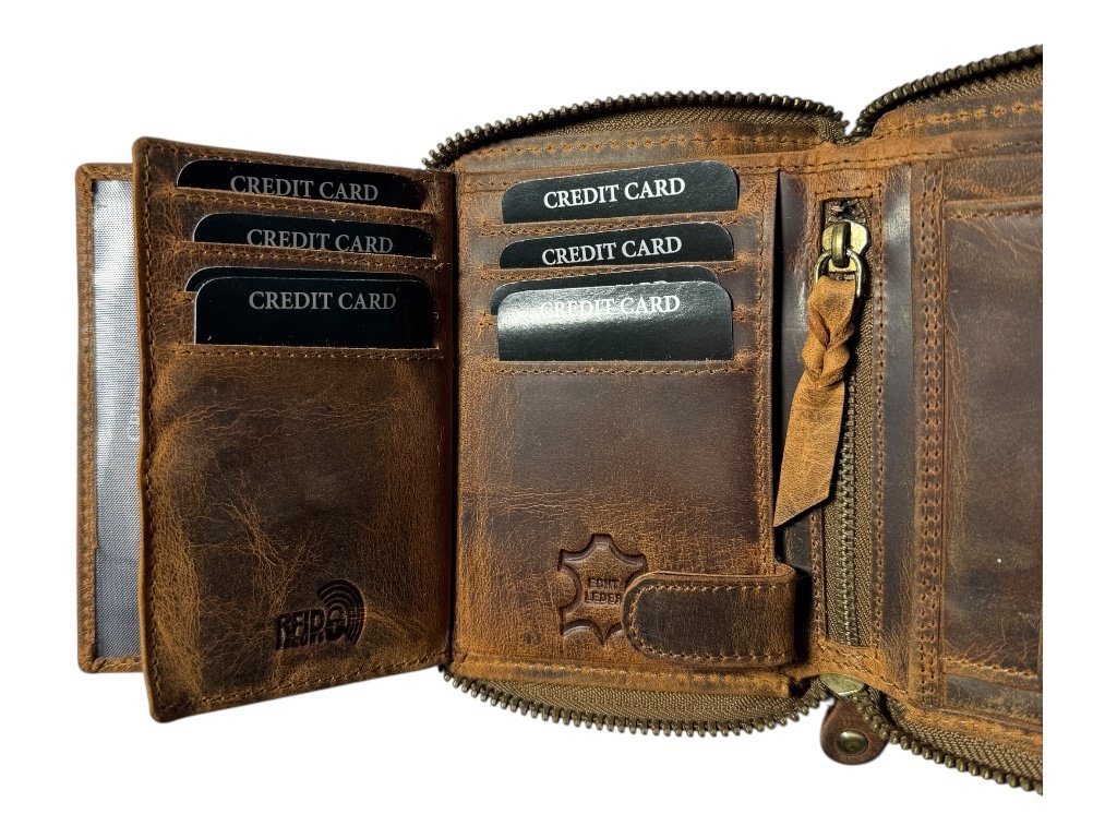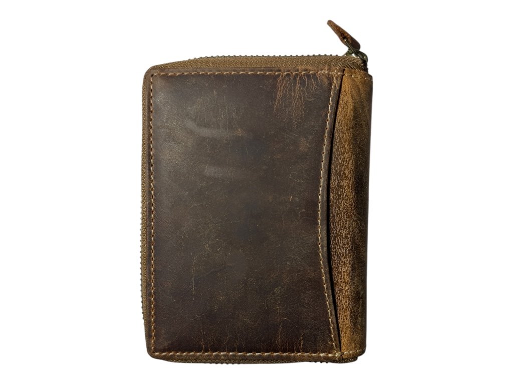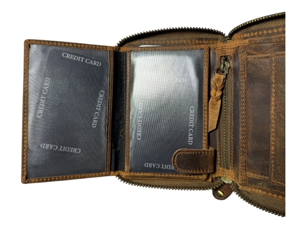 Má robustní kovový zip po celém obvodu, který chrání obsah peněženky před vypadnutím i poškozením.