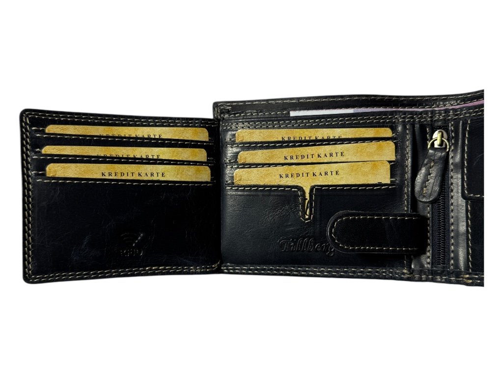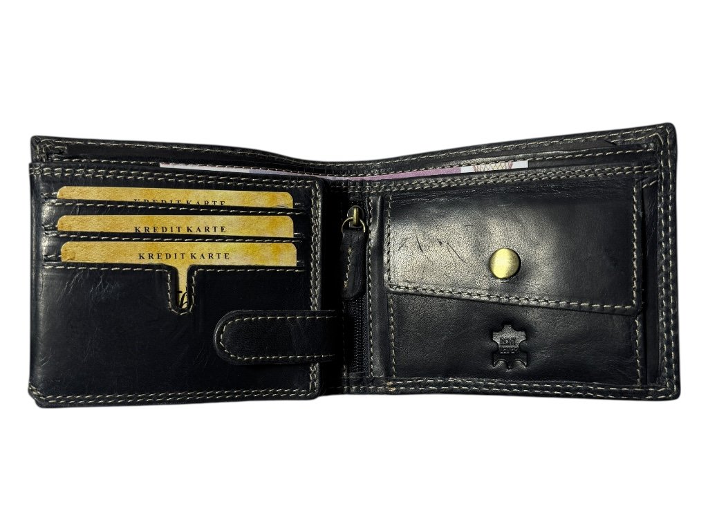 Peněženka nabízí 13 přihrádek na karty, dvě prostorné kapsy na bankovky, malou kapsu na zip a kapsu na drobné s cvočkem. Díky promyšlenému vnitřnímu uspořádání budete mít všechny své doklady a peníze přehledně uložené.