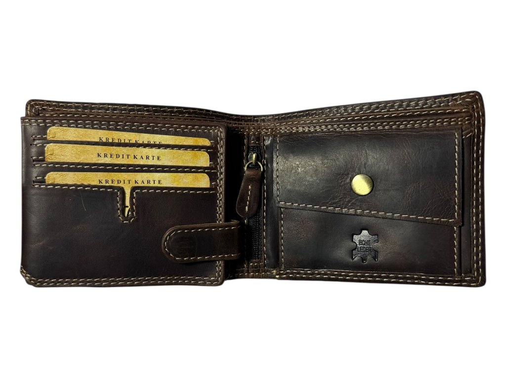 Peněženka nabízí 13 přihrádek na karty, dvě prostorné kapsy na bankovky, malou kapsu na zip a kapsu na drobné s cvočkem. Díky promyšlenému vnitřnímu uspořádání budete mít všechny své doklady a peníze přehledně uložené.