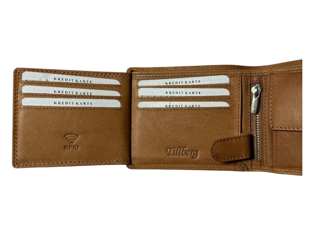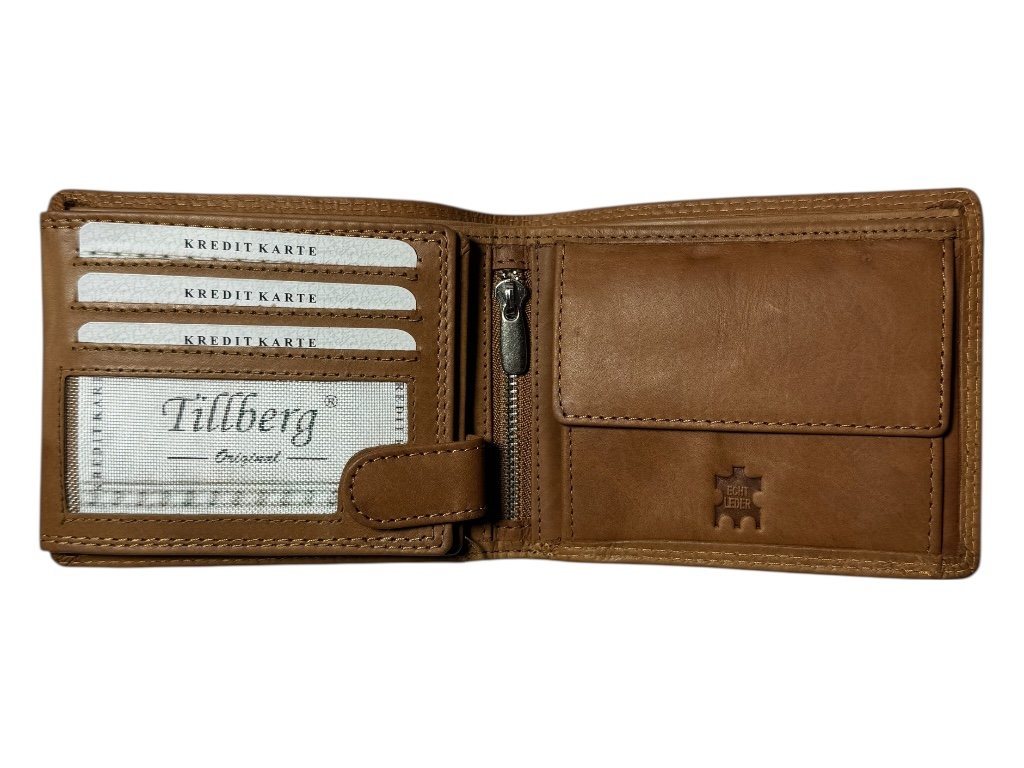 Uvnitř nabízí 13 přihrádek na platební a věrnostní karty, dvě kapsy na bankovky, malou kapsu na zip pro drobnosti a kapsu na mince na cvoček.