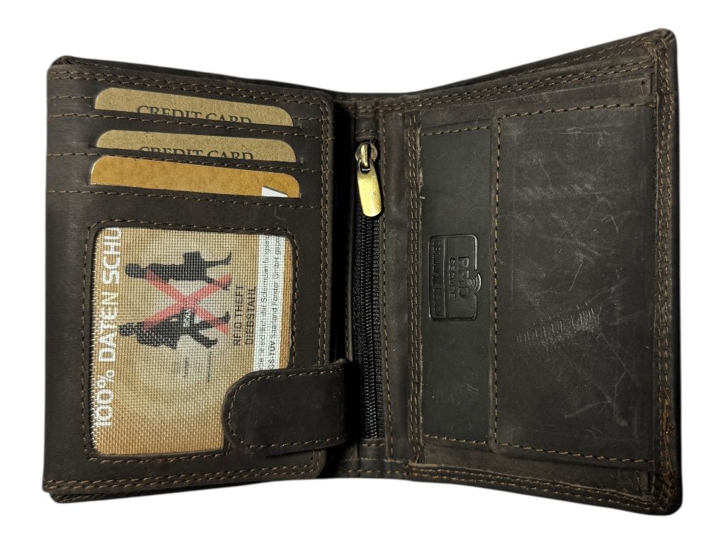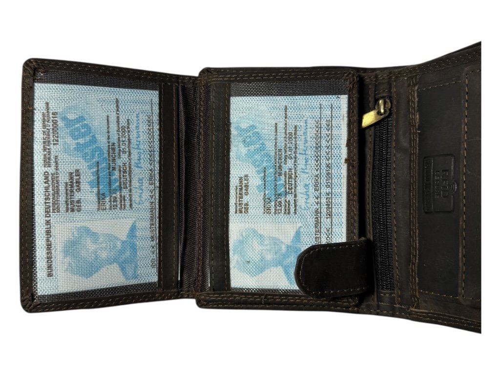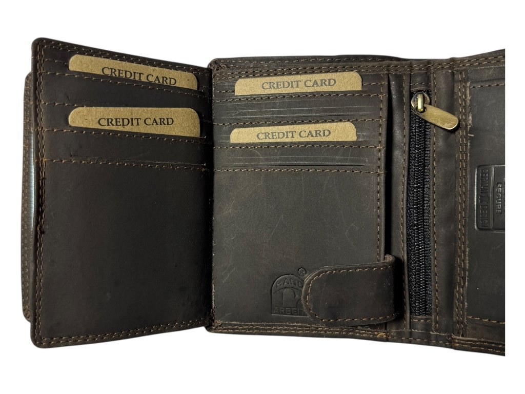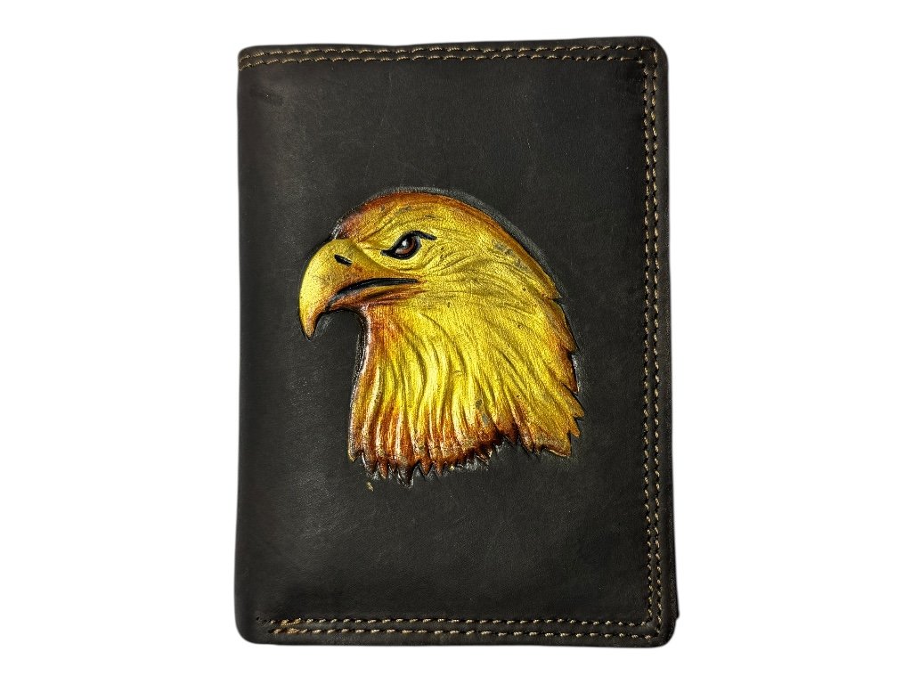 Tato pánská kožená peněženka s motivem orla spojuje výrazný design s poctivým řemeslným zpracováním. Reliéfní motiv orla je ručně barvený, takže každá peněženka má jedinečný vzhled.