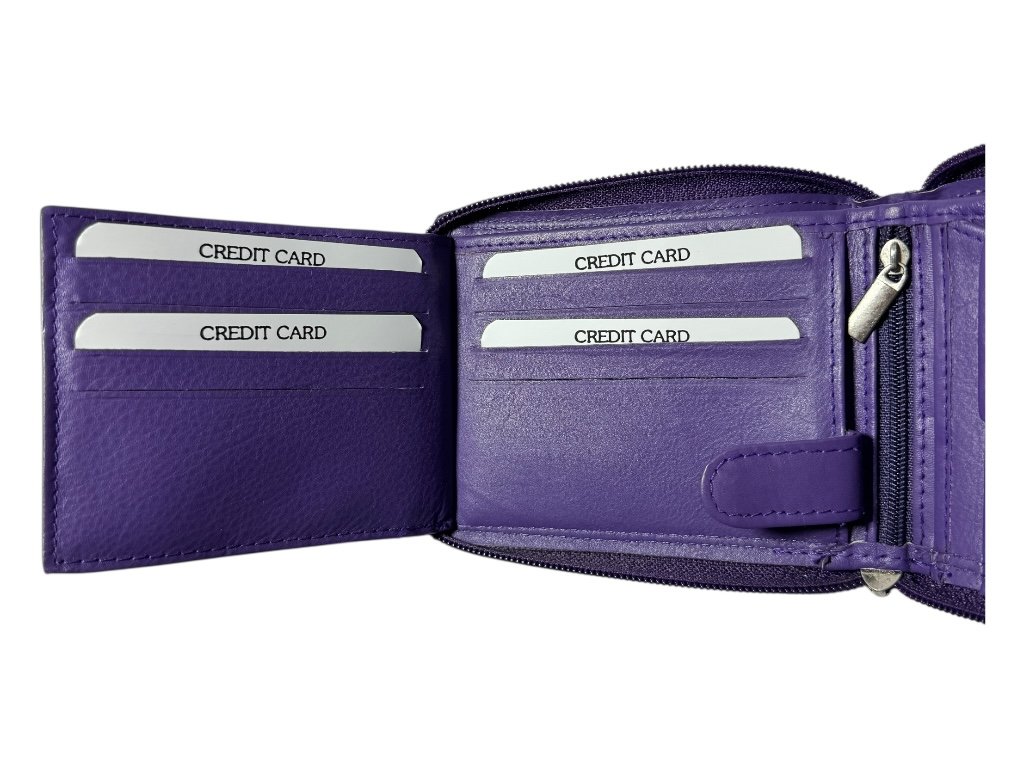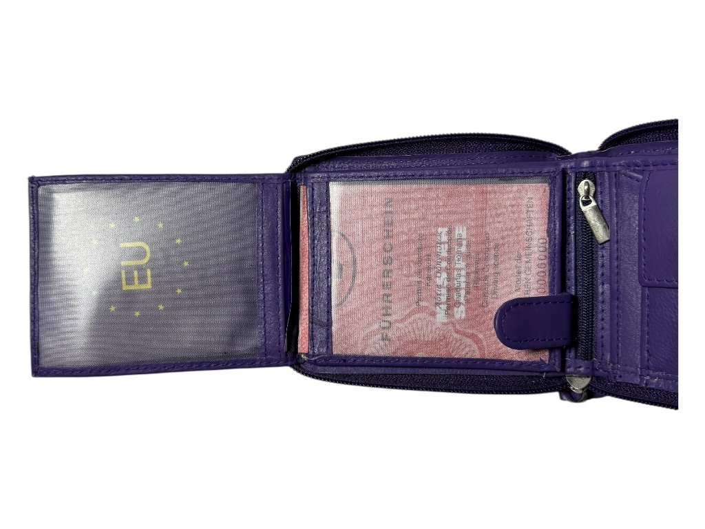 Peněženka nabízí 15 přihrádek na karty, 2 prostorné kapsy na bankovky, malou kapsu na zip a kapsu na drobné uzavíratelnou na cvoček.