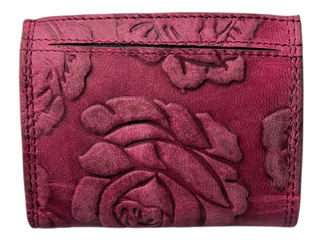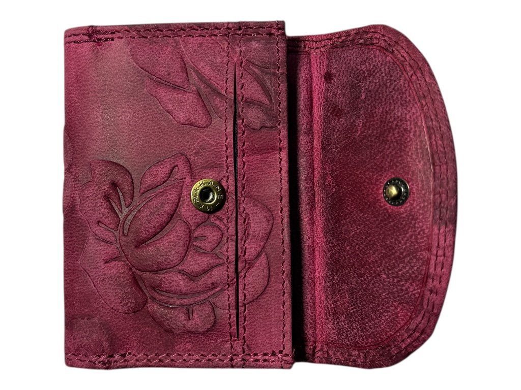 Tato malá kožená peněženka je skvělou volbou pro ženy, které hledají spojení praktičnosti a originálního designu. Reliéfní květinové zdobení dodává peněžence luxusní a jedinečný vzhled, který si okamžitě zamiluješ.