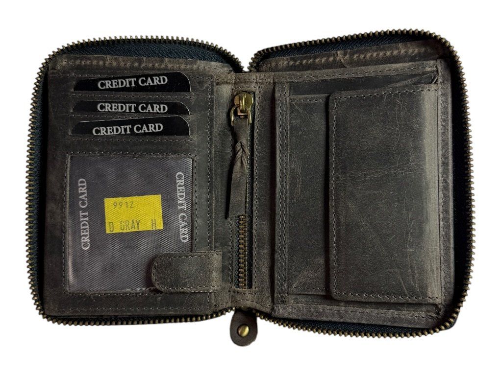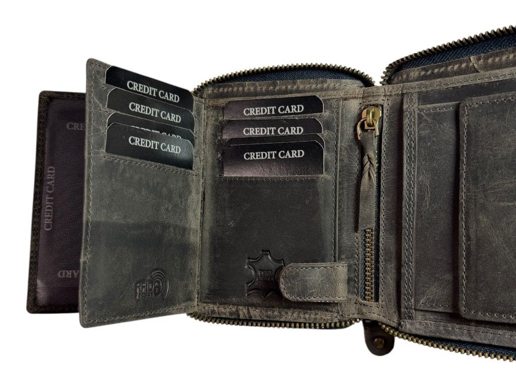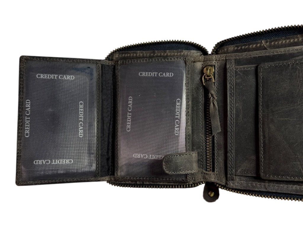 Kožená peněženka DARGELIS s uzavíráním na zip po celém obvodu, velkým prostorem na karty a praktickým vnitřním uspořádáním.