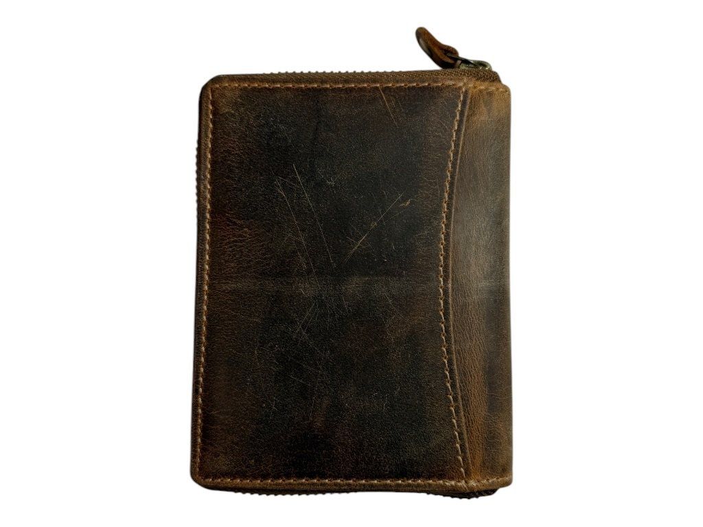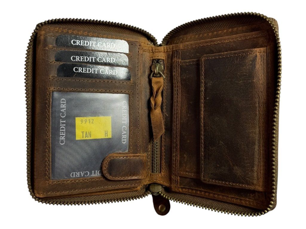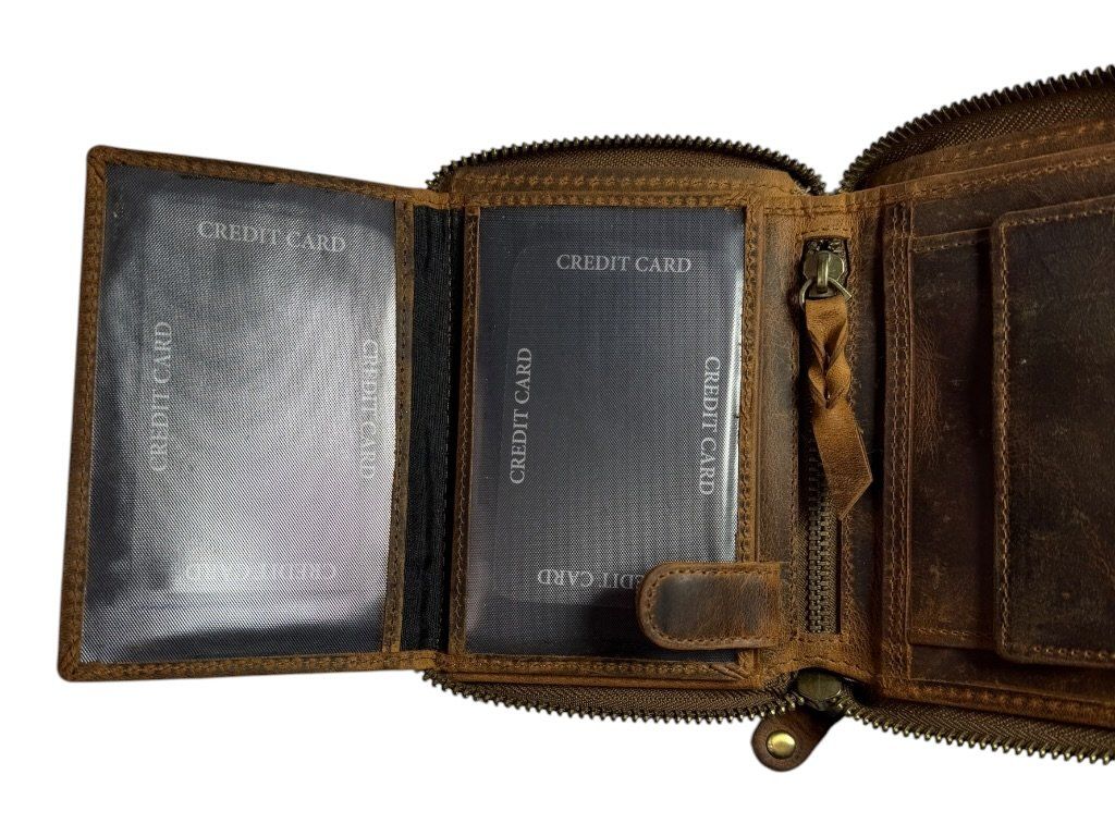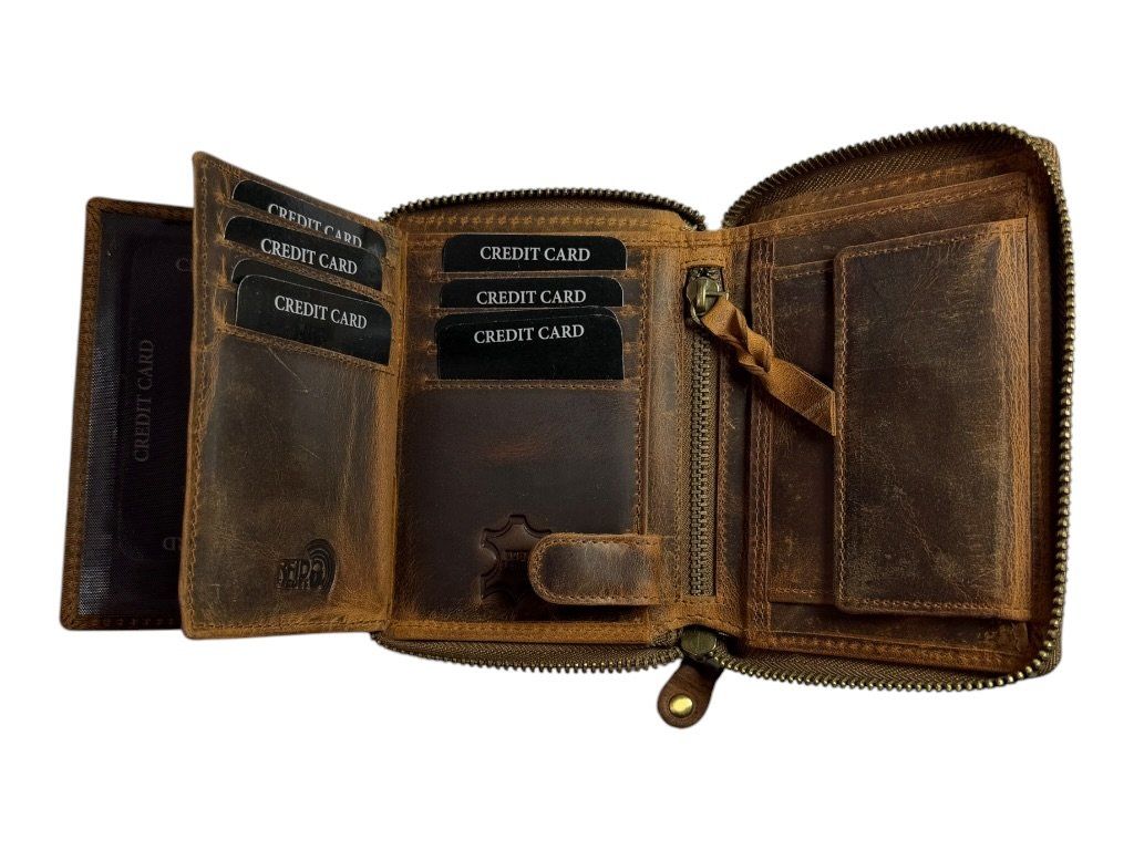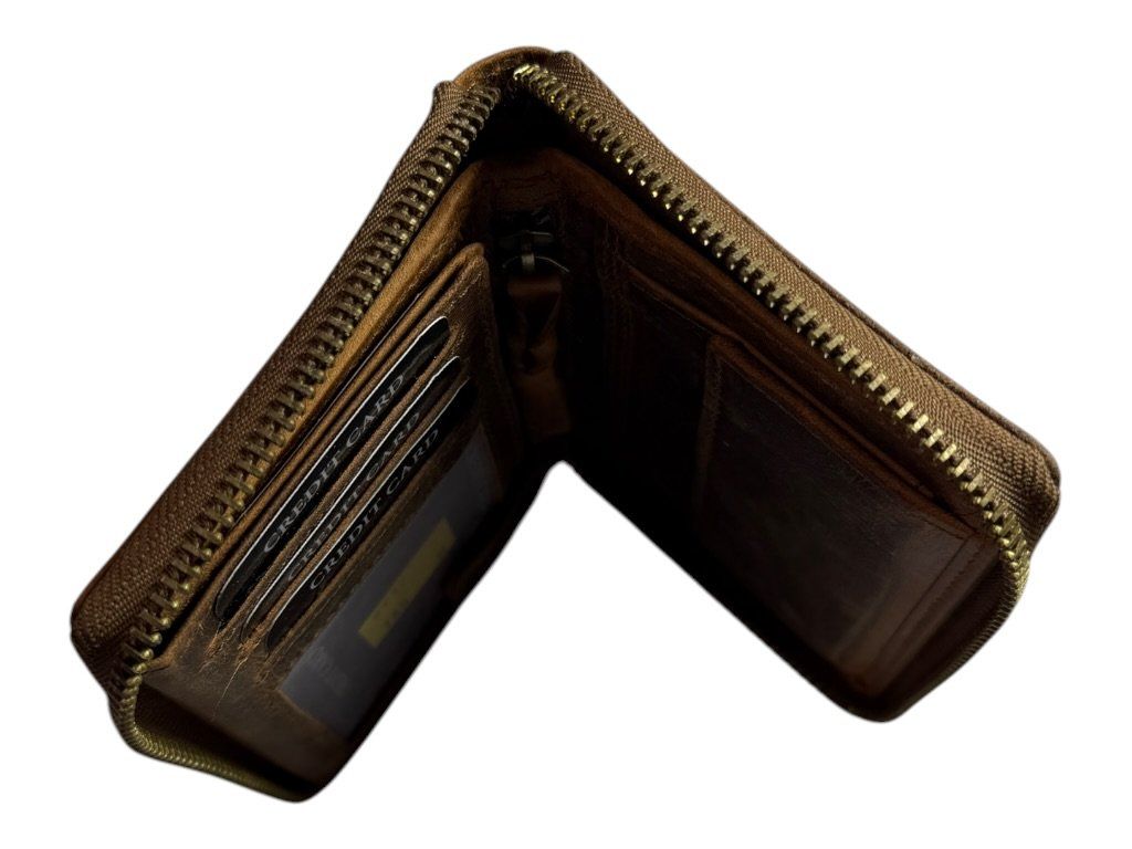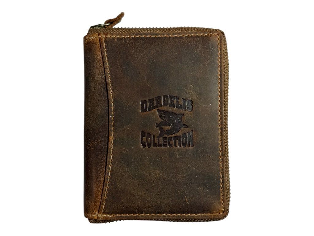 Kožená peněženka DARGELIS s uzavíráním na zip po celém obvodu, velkým prostorem na karty a praktickým vnitřním uspořádáním.