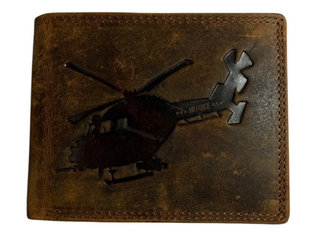 Stylová kožená peněženka s originálním motivem vrtulníku na přední straně, která zaujme na první pohled.