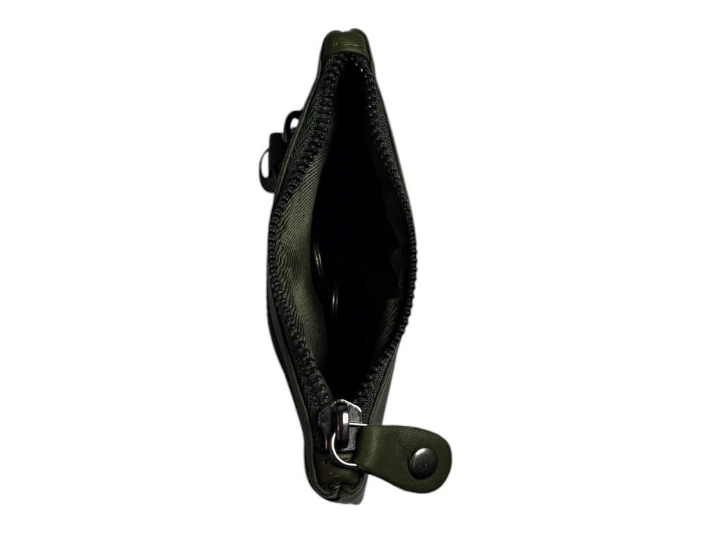 Hlavní kapsa na zip ukrývá dva kovové kroužky na klíče, které umožňují jejich přehledné rozdělení a bezpečné uložení. Na přední straně se nachází menší kapsa na zip, vhodná například na mince nebo drobnosti.