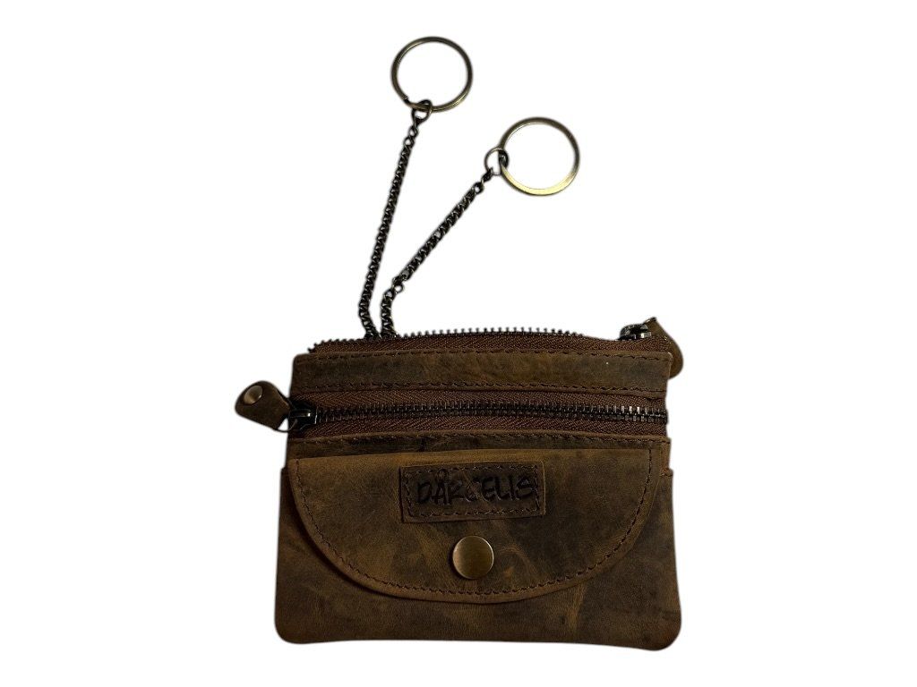 Kožené pouzdro na klíče Dargelis v hnědé barvě nabízí praktické uložení díky dvěma kroužkům na klíče a kombinaci zipu a přední kapsy na patent. Ideální pro každodenní organizaci drobností.