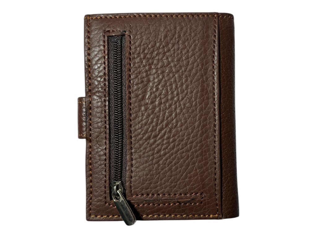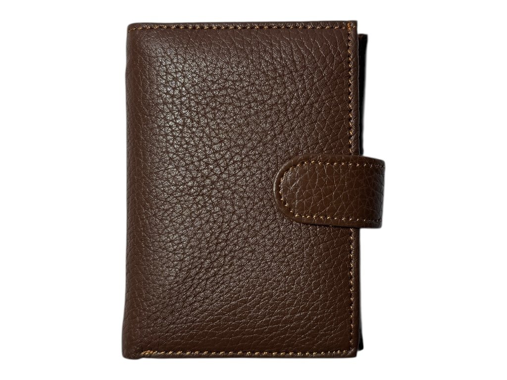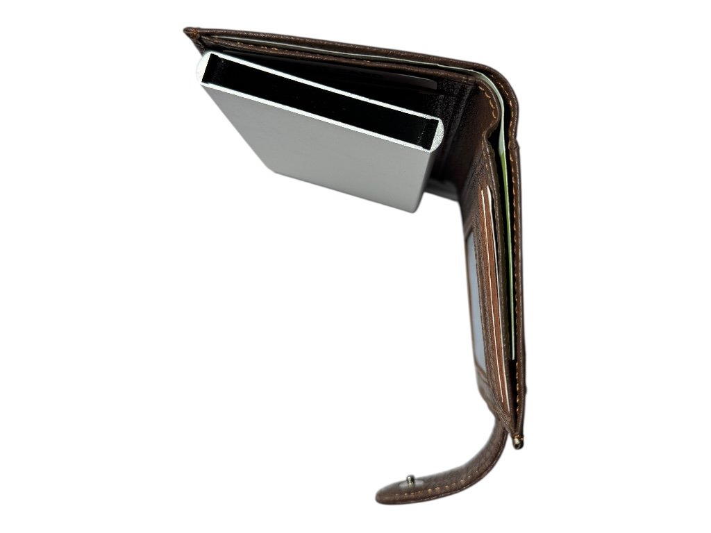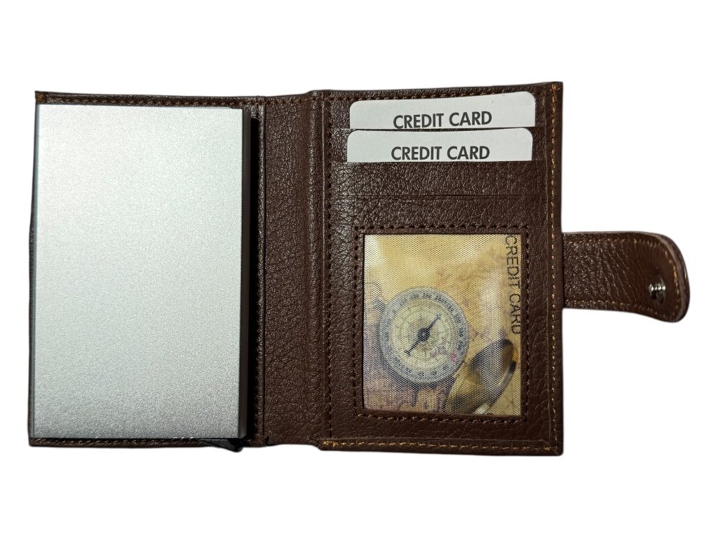Kvalitní hnědá kůže s jemnou strukturou doplněná o hliníkové pouzdro chrání vaše karty před ohnutím i zneužitím díky RFID ochraně.